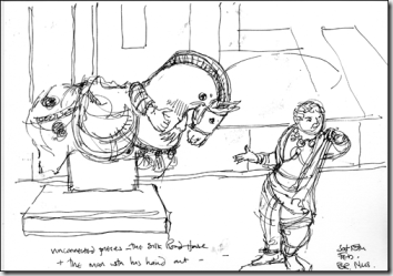 My sketch of the spotted peg leg Tang period horse. It is “made of painted clay and wood and was found buried in a tomb near a major Silk Road administrative centre”.